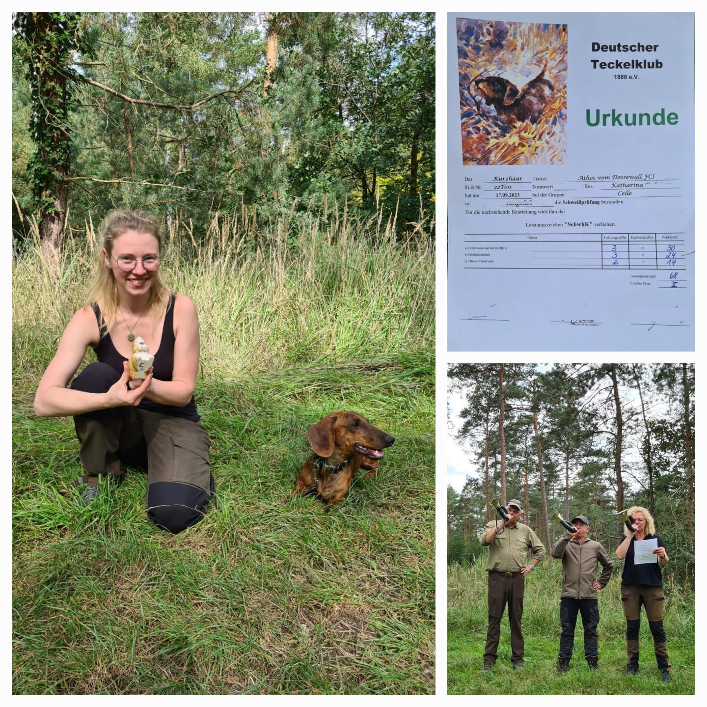 Aus dem A-Wurf hat Athos vom Dossewall die Schweißprüfung abgelegt und im II. Preis bestanden, die Temperaturen forderten Mensch und Tier einiges ab. Unsere herzlichen Glückwünsche gehen an die Besitzer- und Hundeführerin Katharina D.